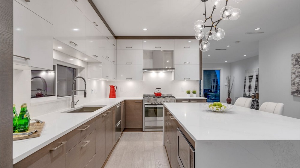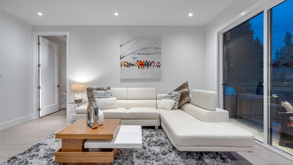 The interior design incorporates a palette of white tones, contrasted with grey and wooden accents.