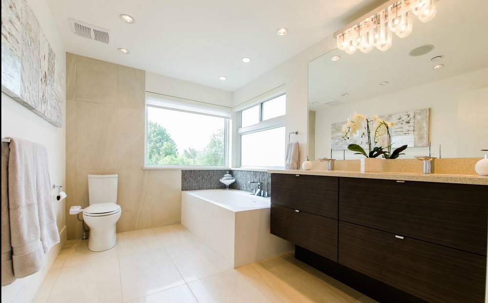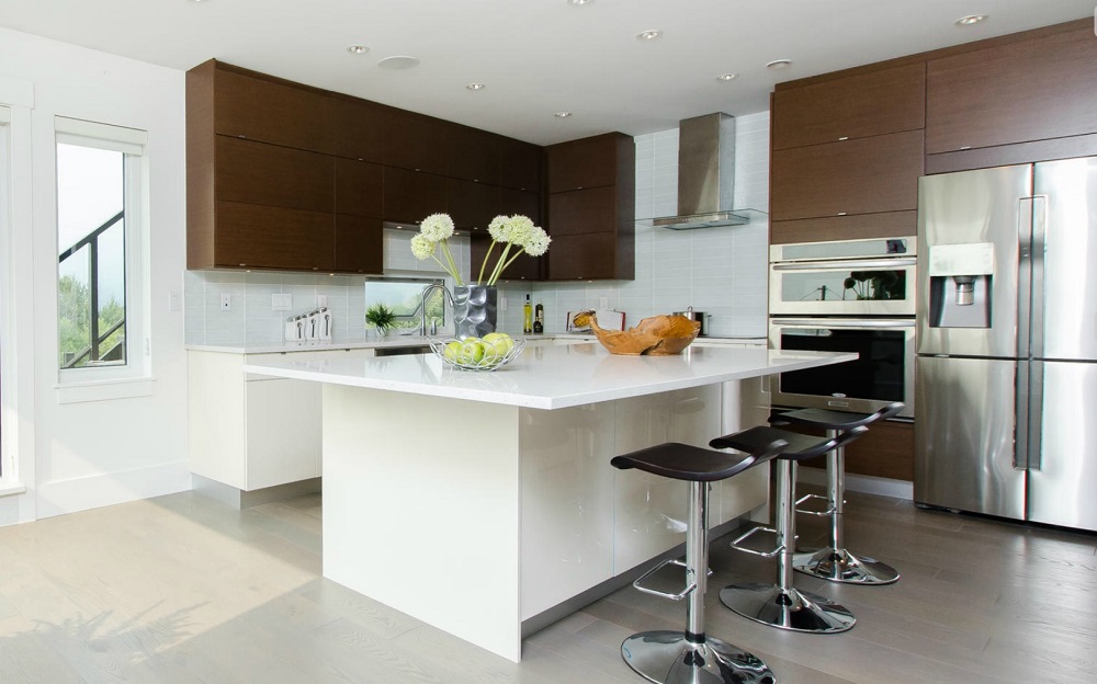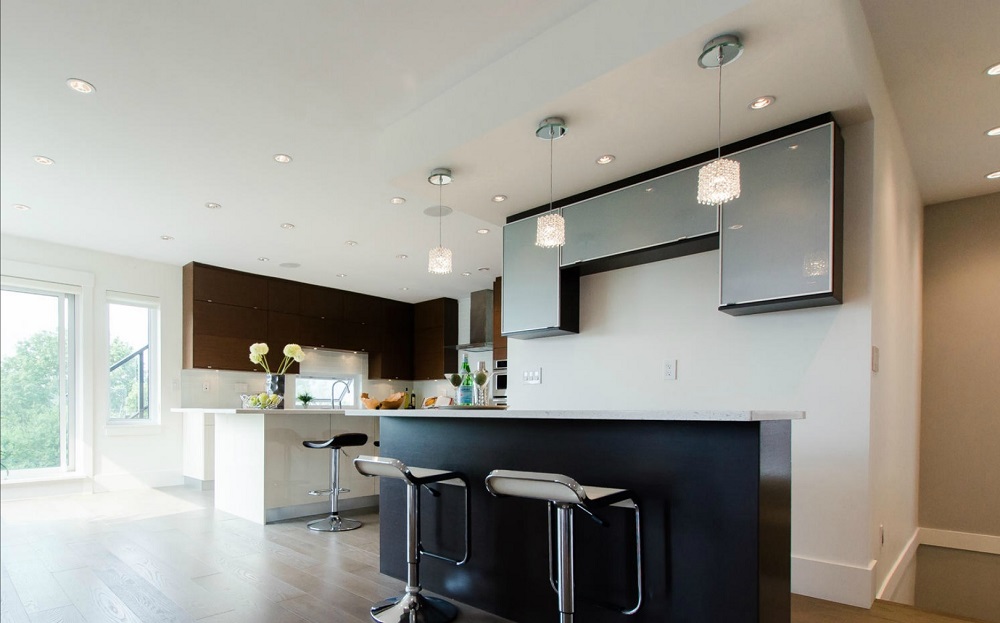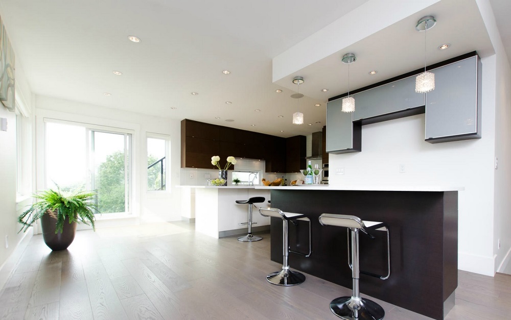 through the use of clean lines, bold monotone hues, and sleek glass railings